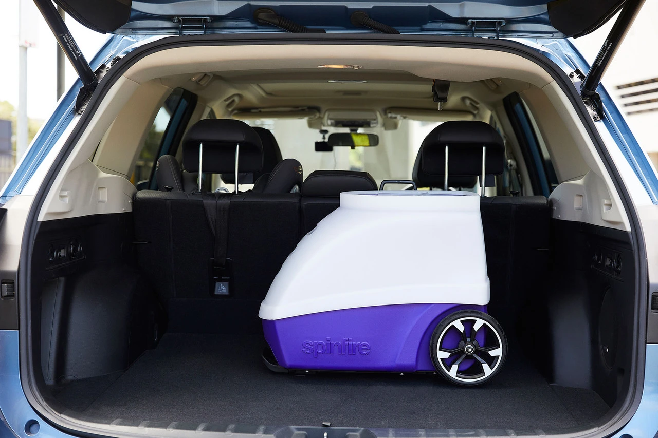 Lightweight and compact, the Spinfire Pro 2 fits in the boot of most cars. The white hopper can be reversed to neatly cover the machine. Robust wheels and an extendable handle allow you to pull or push the machine anywhere.