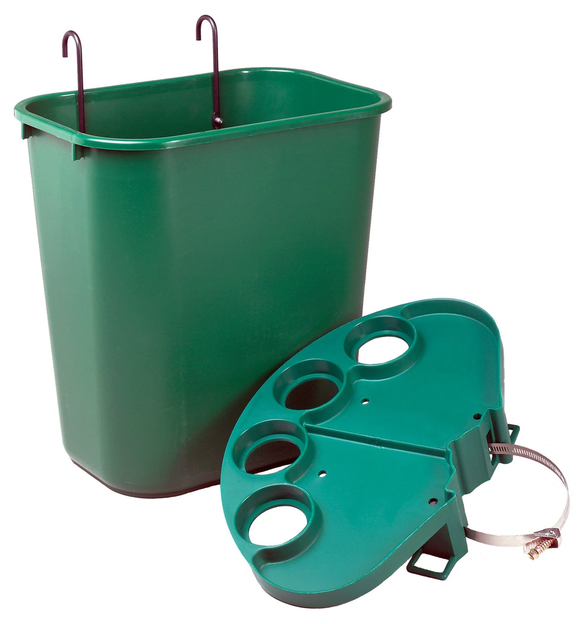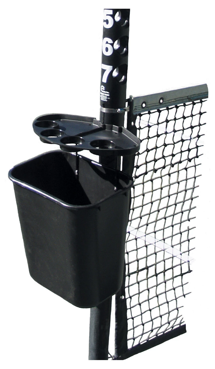 Tourna Tennis Court Tidy Bin comes with a tray to attach to a tennis post, then the bin hangs below the tray. Drill holes in the basket to allow rain water to escape.